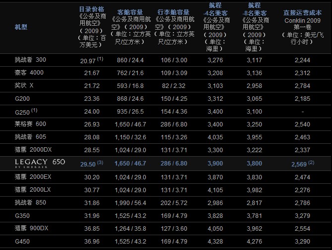 對(duì)比總覽 (1) 灣流公司官網(wǎng)(2009年9月) (2) 直接運(yùn)營(yíng)成本(DOC)的計(jì)算是基于《Conklin & de Decker 2009》第一卷假設(shè)的條件。計(jì)算時(shí)考慮了羅爾斯羅伊斯企業(yè)維護(hù)方案(RR Corporate Care)發(fā)動(dòng)機(jī)維護(hù)成本。本結(jié)果僅供對(duì)比之用。 (3) 萊格賽650的價(jià)格是基于2010年經(jīng)濟(jì)狀況