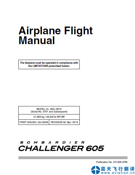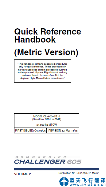 北京藍天飛行翻譯公司完成大型公務(wù)機公司的第32版/2015年3月18日版本龐巴迪挑戰(zhàn)者605全套飛行手冊翻譯任務(wù):第32版龐巴迪挑戰(zhàn)者605飛機飛行手冊、機組操作手冊、快速檢查單 Revision 32 Mar 18/15 Bombardier Challenger 605 Airplane Flight Manual, Flight Crew Operating Manual, Quick Reference Handbook Translation ![]() 龐巴迪挑戰(zhàn)者605飛機飛行手冊 Bombardier Challenger 605 Airplane Flight Manual ![]() 龐巴迪挑戰(zhàn)者605機組操作手冊第一冊 Bombardier Challenger 605 Flight Crew Operating Manual ![]() 龐巴迪挑戰(zhàn)者605機組操作手冊 Bombardier Challenger 605 Flight Crew Operating Manual ![]() 龐巴迪挑戰(zhàn)者605快速檢查單第一冊 Bombardier Challenger 605 Quick Reference Handbook ![]() 龐巴迪挑戰(zhàn)者605快速檢查單第二冊 Bombardier Challenger 605 Quick Reference Handbook |