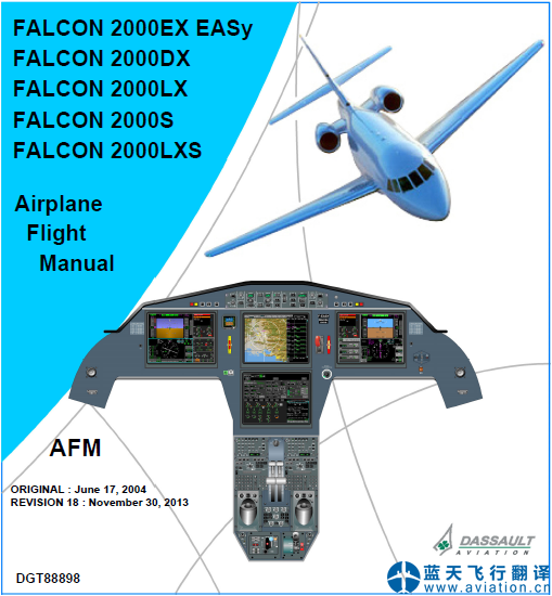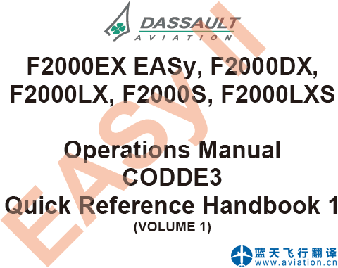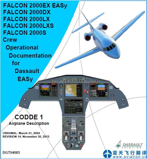 北京藍天飛行翻譯公司完成金鹿公務(wù)機公司的達索獵鷹2000公務(wù)機全套飛行手冊翻譯任務(wù) Dassault FALCON 2000 Business Jet Manual Translation 達索獵鷹2000公務(wù)機全套飛行手冊包括: FALCON 2000EX EASy、FALCON 2000DX、FALCON 2000LX、FALCON 2000LXS、FALCON 2000S 機型 Crew Operational Documentation for Dassault EASy CODDE 1 Airplane Description REVISION 14: November 30, 2013 獵鷹2000EX EASy、獵鷹2000DX、獵鷹2000LX、獵鷹2000LXS、獵鷹2000S 機型 達索EASy機組操作手冊 CODDE 1 飛機描述 修訂14: November 30, 2013 ![]() 獵鷹2000公務(wù)機機組操作手冊 FALCON 2000 Crew Operational Documentation for Dassault EASy FALCON 2000EX EASy、FALCON 2000DX、FALCON 2000LX、FALCON 2000S、FALCON 2000LXS 機型 Crew Operational Documentation for Dassault EASy CODDE 2 REVISION 16 : November 30, 2013 ![]() 獵鷹2000公務(wù)機機組操作手冊 FALCON 2000 Crew Operational Documentation for Dassault EASy F2000EX EASy、F2000DX、F2000LX、F2000S、F2000LXS Operations Manual CODDE3 Quick Reference Handbook 1和2 Revision 18 30-NOV-13 F2000EX EASy、F2000DX、F2000LX、F2000S、F2000LXS 操作手冊l CODDE3 快速檢查單 1和2 修訂 18 30-NOV-13
