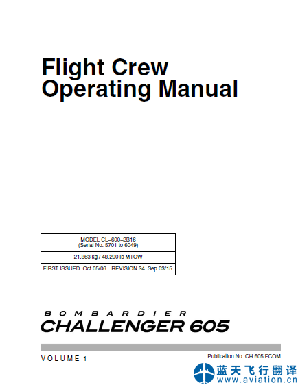 北京藍(lán)天飛行翻譯公司完成公務(wù)機(jī)公司的第34版龐巴迪挑戰(zhàn)者605全套飛行手冊(cè)翻譯任務(wù) REVISION 34: Sep 03/15 Bombardier Challenger 605 Flight Manual Translation 第34版龐巴迪挑戰(zhàn)者605飛機(jī)飛行手冊(cè) Bombardier Challenger 605 Airplane Flight Manual
