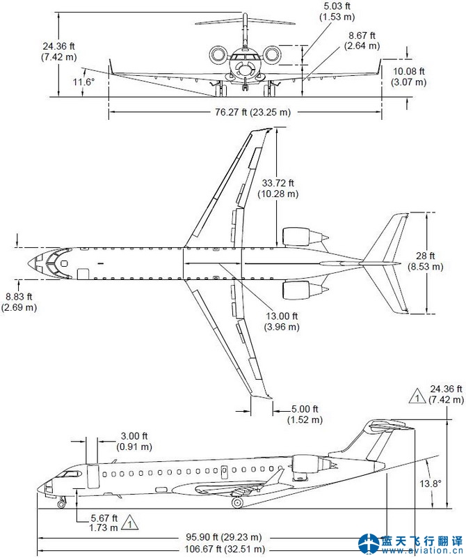 ![]() CRJ700飛機(jī)尺寸 ![]() CRJ700 快速檢查單 CRJ700 QUICK REFERENCE HANDBOOK ![]() CRJ700 快速檢查單 CRJ700 QUICK REFERENCE HANDBOOK CRJ700飛機(jī)是CRJ200飛機(jī)的加長(zhǎng)型,兩者在機(jī)體結(jié)構(gòu)和操縱使用方面具有很高的通用性。與CRJ200相比,CRJ700的主要特點(diǎn)是:通過(guò)在CRJ200中機(jī)身的前、后方加入艙段,增大了 機(jī)身和客艙長(zhǎng)度;通過(guò)在機(jī)翼根部增加插入段,增大了翼展;換裝了推力更大的新型發(fā)動(dòng)機(jī);每客千米的直接使用成本降低了20%。該機(jī)的維修間隔時(shí)間設(shè)計(jì)為A檢400h,C檢4000h。采用帶有翼翹的后掠式下單翼;后部機(jī)身靠上安裝兩臺(tái)通用電氣CF34渦輪風(fēng)扇發(fā)動(dòng)機(jī);具有后掠式T型垂直尾翼和水平尾翼。其機(jī)翼前緣前伸,并加裝了前緣縫翼。主起落架結(jié)構(gòu)也進(jìn)行了加強(qiáng),采用新的輪胎和剎車系統(tǒng),設(shè)計(jì)壽命提高。 除特別指明外,以下描述均針對(duì)CRJ701與CRJ200的不同之處。 機(jī)身 前機(jī)身加長(zhǎng)3.96m,后機(jī)身加長(zhǎng)0.76m。 機(jī)翼 翼展增加1.83m。機(jī)翼前緣前伸,并加裝了前緣縫翼。 尾翼 尾翼增大了平尾面積。 起落架 液壓收放的前三點(diǎn)起落架,均為雙輪,由美國(guó)古德里奇公司提供。設(shè)計(jì)壽命提高到80000次起降。主起落架支柱延長(zhǎng),采用新的機(jī)輪、輪胎和剎車裝置,其中輪胎壽命提高到250~400次著陸 ,剎車片壽命提高到1600次著陸剎車。主輪輪胎規(guī)格36×12.0-18,胎壓10.55×105Pa。前輪輪胎規(guī)格20.5×6.75-10,胎壓9.24×105Pa。動(dòng)力裝置 2臺(tái)尾吊安裝的CF34-8C1渦扇發(fā)動(dòng)機(jī),單臺(tái)額定推力為56.4kN(不包括自動(dòng)功率儲(chǔ)備)或61.3kN(包括自動(dòng)功率儲(chǔ)備),可在氣溫30。C,其他條件符合國(guó)際標(biāo)準(zhǔn)大氣的情況下保持推力。CRJ705換裝了CF34-8C5渦扇發(fā)動(dòng)機(jī),單臺(tái)額定推力為58.4kN(不包括自動(dòng)功率儲(chǔ)備)或64.5kN(包括自動(dòng)功率儲(chǔ)備)。CRJ705還可選裝CF34-8C5A1渦扇發(fā)動(dòng)機(jī)。有反推力裝置。全權(quán)數(shù)字電子控制。機(jī)內(nèi)總?cè)加腿萘繛?0989L,有壓力和重力加油口。[5] 駕駛艙與客艙 全增壓機(jī)艙,雙人制駕駛艙。客艙標(biāo)準(zhǔn)布局為70座,每排4座并有中央通道,排距79cm,中央通道寬41cm,高1.89m?团摰匕褰档2.5cm,頂板抬高1.3cm,舷窗位置抬高11.5cm。衣櫥、廚房和盥洗室有多種組合方式,具體取決于客艙布局。重新設(shè)計(jì)了頭頂行李柜,并在客艙前部地板下方左側(cè)新設(shè)1個(gè)容 積為3.08m3的行李艙,全機(jī)行李艙容積增加了近10m3。CRJ705的客 艙標(biāo)準(zhǔn)布局為75座,每排4座并有中央通道,爵士航空公司訂購(gòu)的飛機(jī)采用兩級(jí)布局,即公務(wù)艙10座、排距94cm和經(jīng)濟(jì)艙65座、排距87cm。