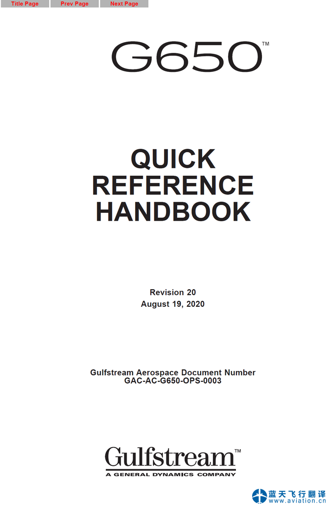 北京藍天飛行翻譯公司完成大型公務機公司的2020年8月19日版本灣流G650快速檢查單翻譯任務 Revision 20 August 19, 2020 G650 QUICK REFERENCE HANDBOOK Translation